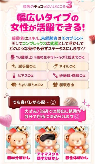 「はむはむしょこら」は、シフトは自由で、他のお仕事との掛け持ちもOKなので、大学生さんは学校帰りに、キャバ嬢さんはお仕事前になど、貴女のライフスタイルに合わせて働けます♪
