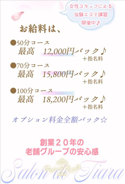 | 日給 | ★6時間出勤の日★ 70分 指名有り トップレス有り 10,800円 70分 トップレス有り 9,800円 100分 トップレス有り 指名有り コスプレ有り 14,200円 合計 34,800円 |