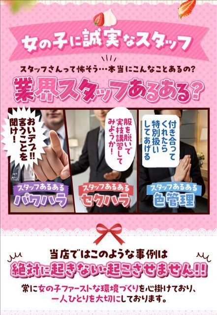 頑張ったら頑張った分だけお給料に反映されるので、モチベーションもアップ♪ノルマや罰金など女の子が存するルールも一切ございません。