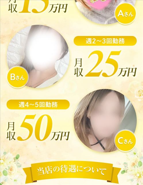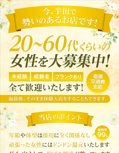 | 応募資格 | 20代~60代位までの女性 ※容姿・経験一切不問 |