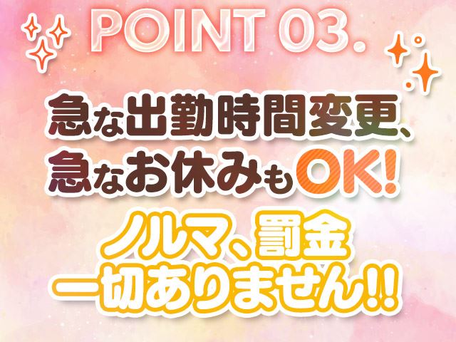 | 勤務時間 | お昼12時~翌深夜3時までの間。 短時間でも長時間でもOKです |