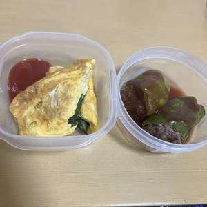 「ピーマンの肉詰め」と「オムレツ」をお弁当にしまし…