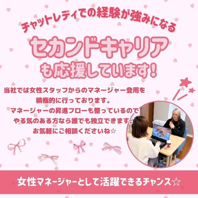 当社では未経験から始めるチャットレディからマネージャーへの昇進フローも整っており、やる気のある方ならどなたでも独立できるようになっています。