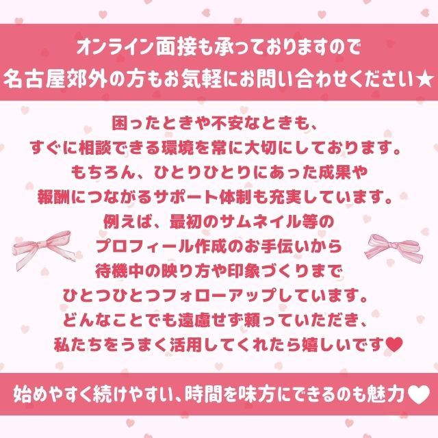 面接も1対1でお話しするのが緊張したり、働くか迷っている・・・といった方のために「お茶会」を開いて当店の女の子達と一緒にカジュアルな雰囲気でお仕事の説明をさせていただくこともありますので、お気軽にご応募くださいね。