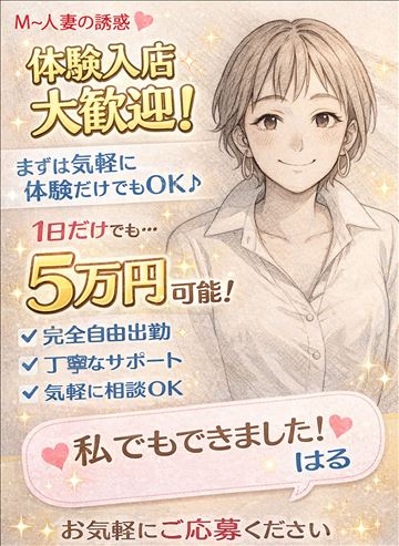 こんばんは、店長です😊“M~人妻の誘惑”では、20代・30代・40代・50代と、幅広い年代の女性を大募集しています✨「体力的に…」「年齢が気になる…」「体型に自信がなくて不安…」そんな風に思っている方も、どうぞご安心ください🌷当店では、未経験の方も…