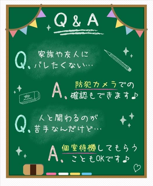 待機する時間は個室でのんびりリラックス、ちょっと空いた時間は自由に休憩したりしてください。人と関わるのが苦手でも個室待機なら変なプレシャーもなし、疲れもとりやすく気持ちにたっぷり余裕が持てるでしょう。