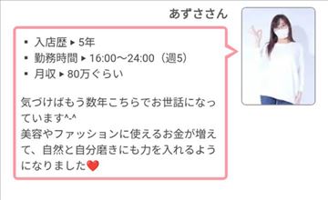 今回ご紹介する 未来のアナタの先輩は… 遅番で絶大な人気を誇る 「あずさ」さんです!! 常にトップクラスの人気を誇りながらも 自分自身への厳しさと 「美」への追求を忘れない 自分磨きに一切の妥協を許さない ストイックで努力家な女性です 3月は遅番ランキングNo.1と とどまる事を知りません!! …
