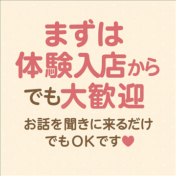 当店はソフトサービス中心&スタッフのサポート体制が万全なので、未経験からスタートした女の子がたくさん活躍しています!もちろん、無理な接客や強要は一切ありません。接客マナーやお話の仕方も、1から丁寧にサポートしますので安心してくださいね。「まずは体験入店から」でも大歓迎♪お話を聞きに来るだけでもOKです💖