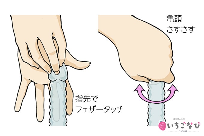 根元から裏筋や亀頭に向かってゆっくり撫で上げるように指1本でサワサワしたり、手のひら全体でゆっくりとやさしくタッチしたりしましょう。