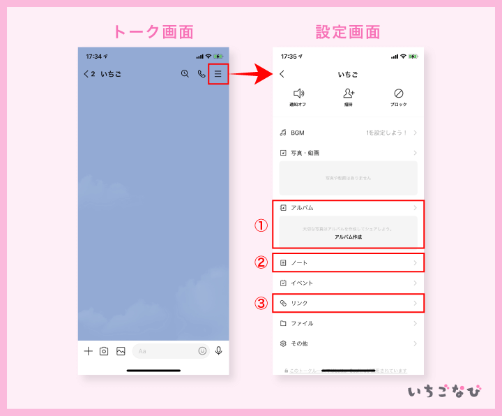 ラインでやりとりしているトークルームの右上に出ている三本線をタップすると、下記のような画像が出てきます。