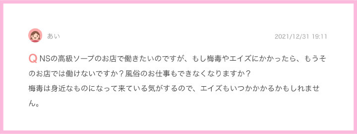 今回は性病についてのお悩み相談について答えていきたいと思います。最近のコラムではいちごなび内での〝⾵俗お悩み相談〟より抜粋してコラムでお答えしていきたいと思います。店舗様がお答えしているものと合わせて、参考になれば幸いです♪