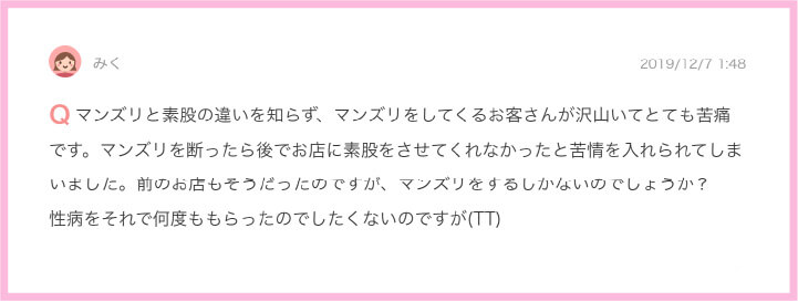 お客様にマンズリをされないようにするためには、まずご⾃⾝が正常位での素股をしないように騎乗位素股などを積極的に⾏うのはどうでしょうか?それでも正常位素股を希望してマンズリを無理やり⾏うお客様であれば『ダメですよー💛お⼝で気持ち良くしますね〜』や『私が上になるね💛』と流れをリードしてみましょう。