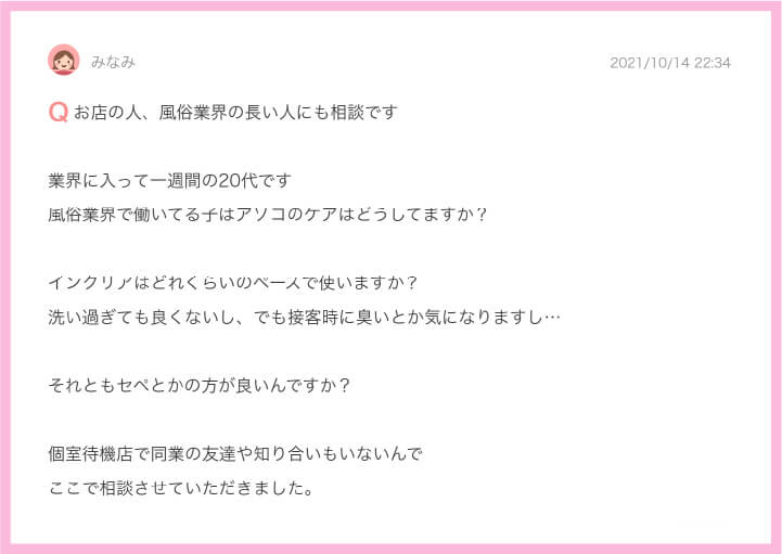 ⾵俗でお仕事をする際に気になる〝デリケートゾーンのケア〟はどうしたら良いかわからないですよね。