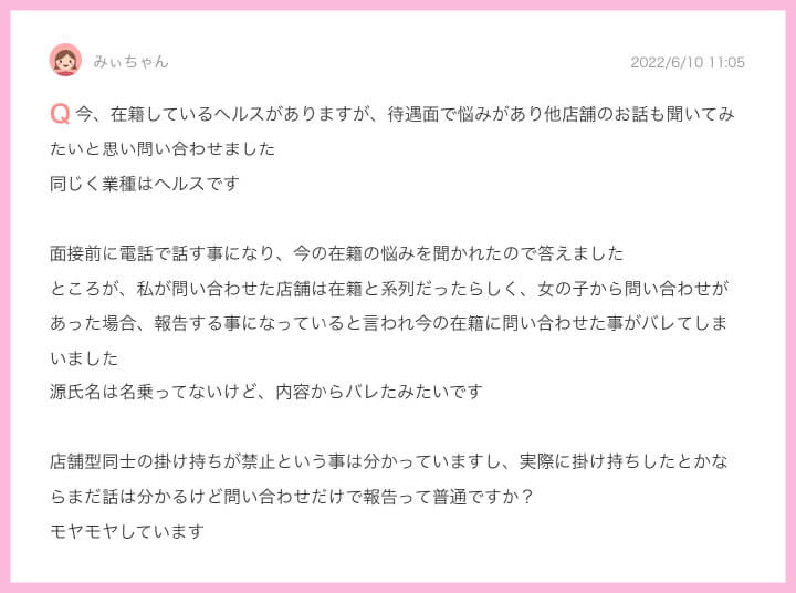 今回のお悩み相談は『⾯接について』の項⽬から抜粋して書きたいと思います。お店によっていろいろな意⾒や考え⽅があります。⼀部のまだ業界をあまり知らない⼥の⼦などにも、知ってもらえればと思います。