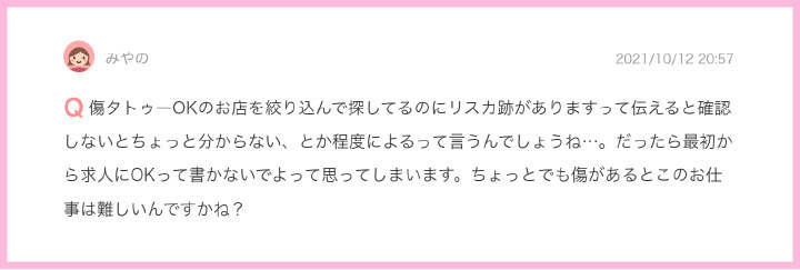 M性感系のお仕事であればタトゥーや傷跡はそんなに気にするお店が少ないのですが、お店のコンセプトとお客様の層にもよってお答えがワンクッション挟んでしまう事も考えられますが、傷タトゥーをOKという表⽰にしないほうが⼥の⼦のためですね。