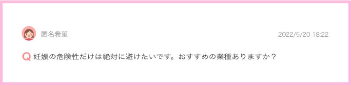 ソフトサービスであればバックは下がってしまうかもしれませんが、妊娠の危険性という部分だけを考えれば安全な業種だと思います。あとは、求⼈でお店を探す際に3ナイ(舐めない・脱がない・触られない)の項⽬をチェックするようにしてみてください。