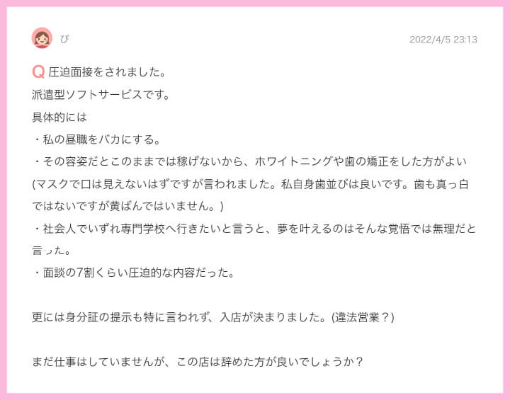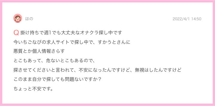 掛け持ちOKと記載してあったにも関わらず、いざ⾯接に⾏ったら『掛け持ちは禁⽌』って告げられるなら良いけど、『なんでうちに来たんですか?』って威圧感を感じるような⾔い⽅をするのは怖いと感じてしまいますよね。