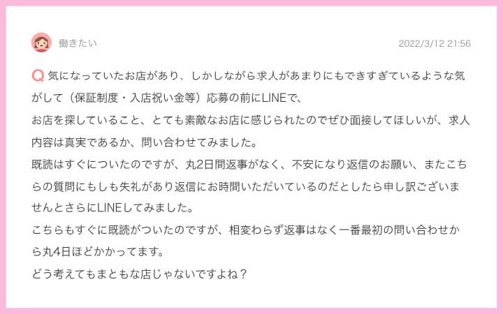 既読無視するようなお店ですから、求⼈には困ってないか何かしらトラブルがあるという解釈にして次のお店へお問合せしましょう。