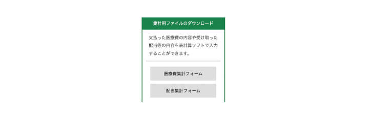右側の部分:医療費集計フォームは1 年間にかかった医療費を表計算で⼊⼒できるフォーマットです。パソコンが必要になるかとは思いますが、確定申告書の作成でデータが読み込まれて反映されるのでPCがある⽅はこちらを使った⽅が便利です。