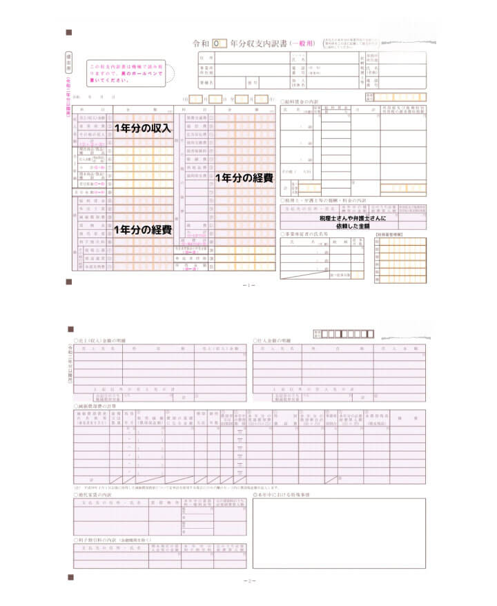 1⽉から12⽉分のまとめた経費と収⼊を記載していきます。お仕事で使うものにパソコンなどがあれば減価償却費になるので検索してみてください。