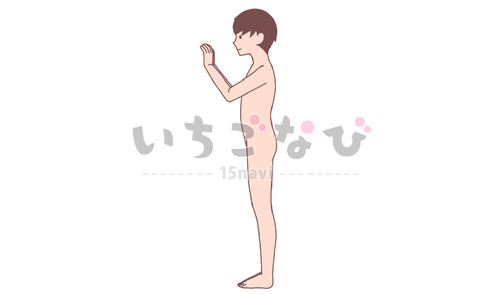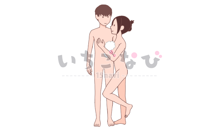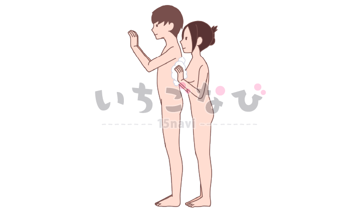 お客様の横に⽴って密着しながら左⼿で体の前⾯を洗いながら、もう⼀⽅の⼿でお尻の⽅から⼿を⼊れてアナル周辺と睾丸周辺を洗う。