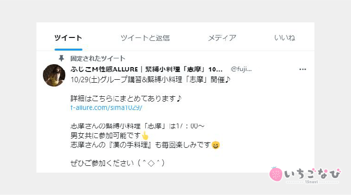投稿した内容を右側の「…」から、『プロフィールに固定する』を選択すると、図のように⾒てもらいたい投稿が固定されます。ここに、予約⽅法や出勤⽇が固定の場合は140⽂字以内で投稿して固定しておくと便利です。
