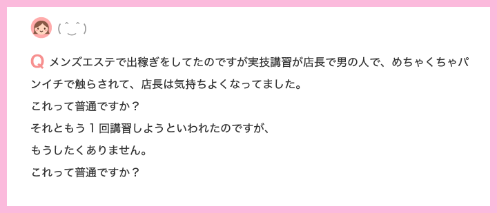 最後の質問にはちょっと強めに答えてしまいましたが、本当にいろいろなお店で業種は違えど〝趣味講習〟をしている所があるって残念です。 だいたいの場合は新⼈の⼥の⼦に対して趣味講習をされる事が多いのも『講習といえばお仕事の⼀環で拒否できないから』という、ただの職権濫⽤。⼥の⼦のスキルアップするために⾏う講習であれば、他のキャストさんたちも交えて⾏うものが安全なのではないかと思います。