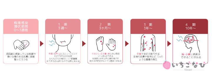 感染してから3週間前後で感染した部分(性器や脣、⼝の中や肛⾨など)に硬いしこりのようなものが出来たり、肌がただれたりする。