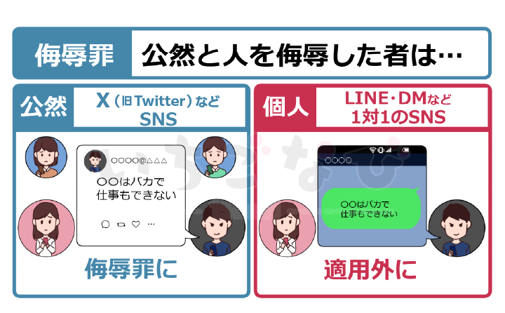 LINEやDMの場合は1対1でのやり取りでの侮辱というのは侮辱罪にならないということになります。ここで⼤きく分かれるのが〝誰にでも⾒られるかどうか〟という事になります。