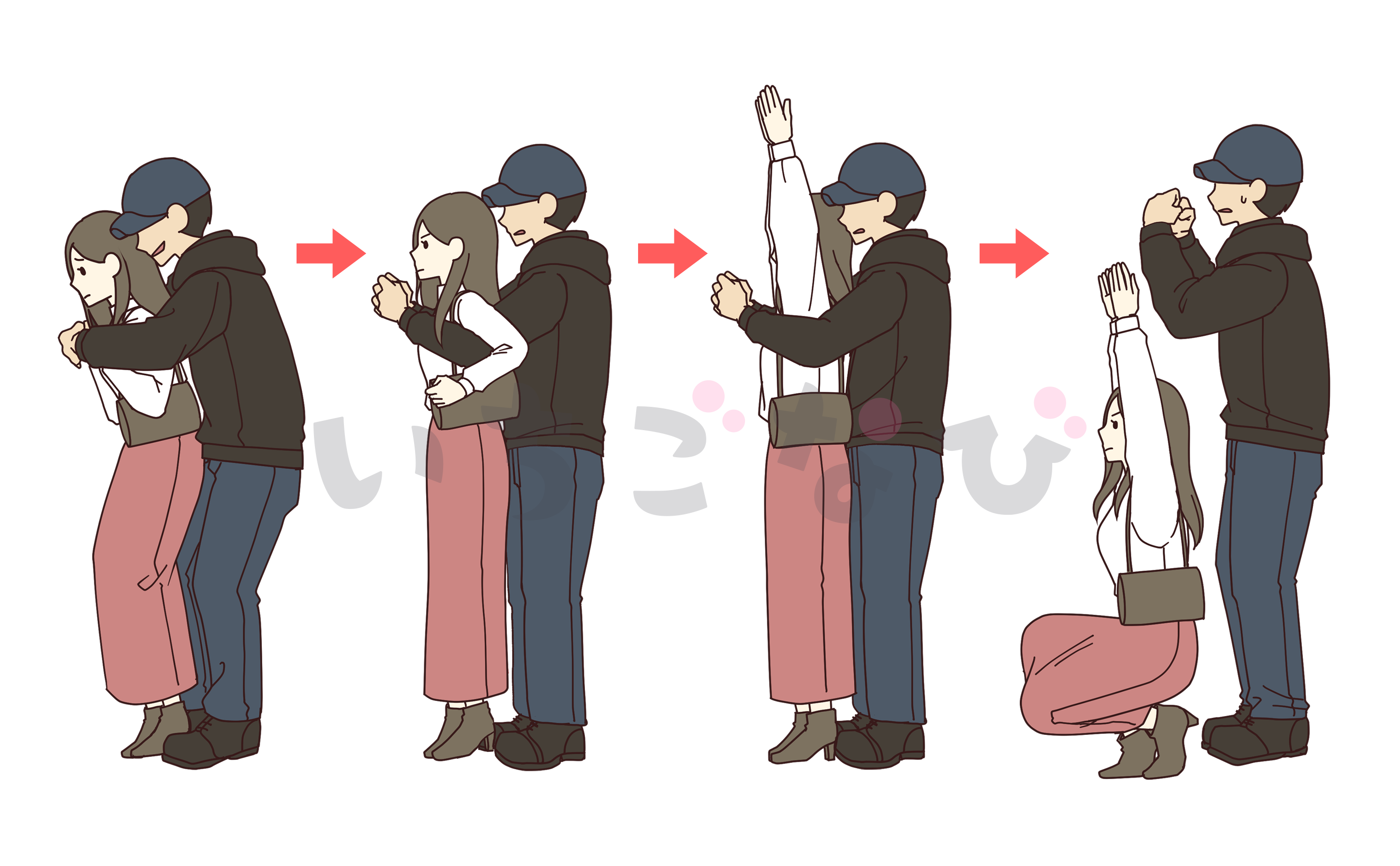 というように動くと男性に抱きつかれても⼒を⼊れなくても⾃分の体重を思いっきり下にかけるだけで男性の腕から抜け出すことができます。