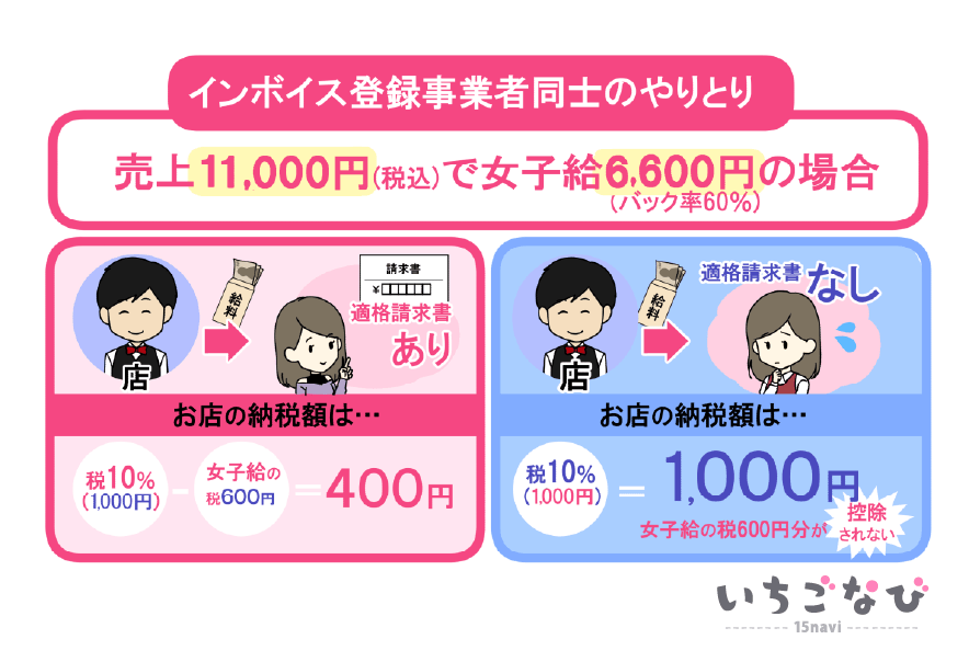今までの場合はお店側が400円を消費税として⽀払っていました。⼥の⼦に600 円の消費税を⽀払っているので、11,000円の消費税分の1,000円から差し引くと、400円になっていました。ですが、インボイス制度によって、⼥の⼦が税務署に届出を出し、なおかつインボイス発⾏ができる適格請求書発⾏事業者として、お店に請求書を出せる状態でない場合は、お店が消費税分1,000円を全額⽀払わないといけなくなるというものです。