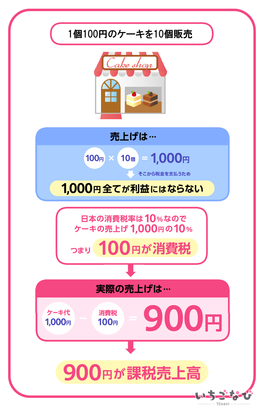 たとえば、あなたがお店でケーキを売るとします。ケーキ1つの値段は100円とします。もし1⽇に10個のケーキを売ると、売上げは100円 × 10個 = 1,000円になります。ですが、この1,000円全部が利益ではありません。税⾦を⽀払わなければいけないお⾦があるのです。