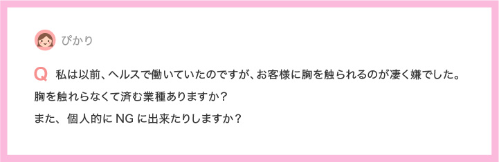 今回のお悩み相談は〝胸を触られるのが嫌な⼈に合う業種について〟お答えしていきたいと思います。