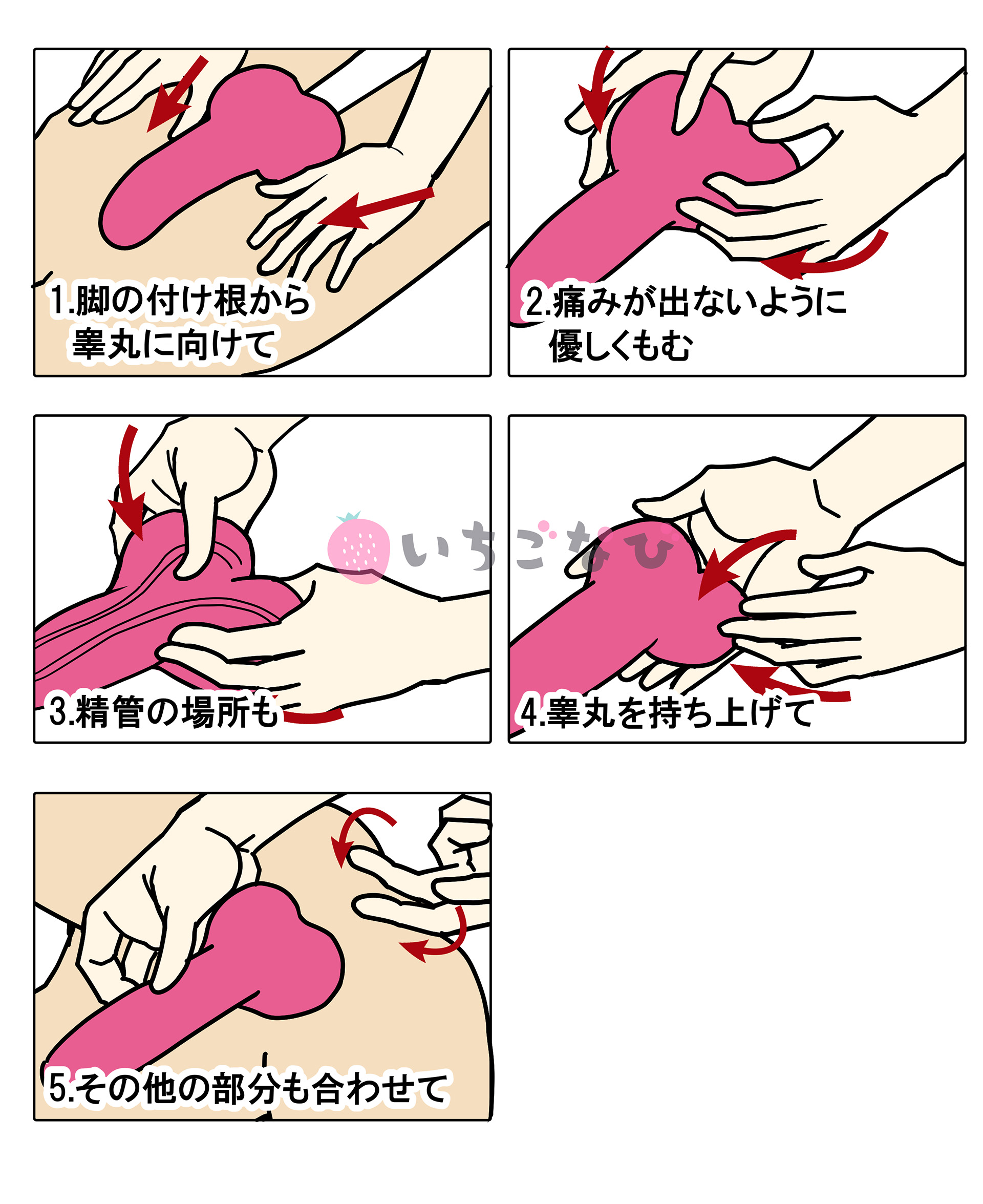 5.チョキの形で睾丸を持ち上げるようにして⽚⽅の⼿で睾丸を撫でるように揉む
