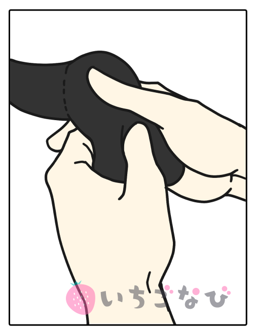 3.⽚⼿で睾丸の付け根をキュッと抑えて反対の⼿で指で睾丸を包むように揉む