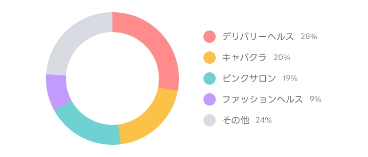 1位は「デリバリーヘルス」で全体の50%と過半数を占める結果となりました。2位は「ソープランド」12%、3位は「ファッションヘルス」11%と僅差でのランクイン。続く4位が「エステ」6%、5位「ピンクサロン」5%、6位「キャバクラ」5%と横並びに。7位「ホテルヘルス」4%、8位「ライブチャット」3%、9位「セクシーキャバクラ」2%、10位「アロママッサージ」2%となりました。半分以上を占めた1位「デリバリーヘルス」の人気が高いという実態が明らかになりました。