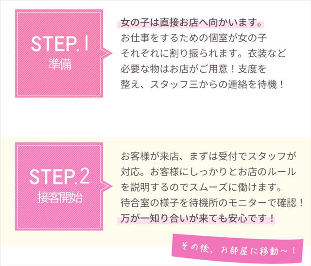女の子が安心して働けるようにモニターチェックを完備しています。お客様の顔を事前に確認できるので、知り合いと鉢合わせる心配は不要です!リスクなく、安心してお仕事に集中していただけます。