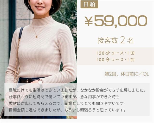 実際に、在籍する女性の約60%が未経験からのスタート。無理なく働けるため、副業としても選ばれています。