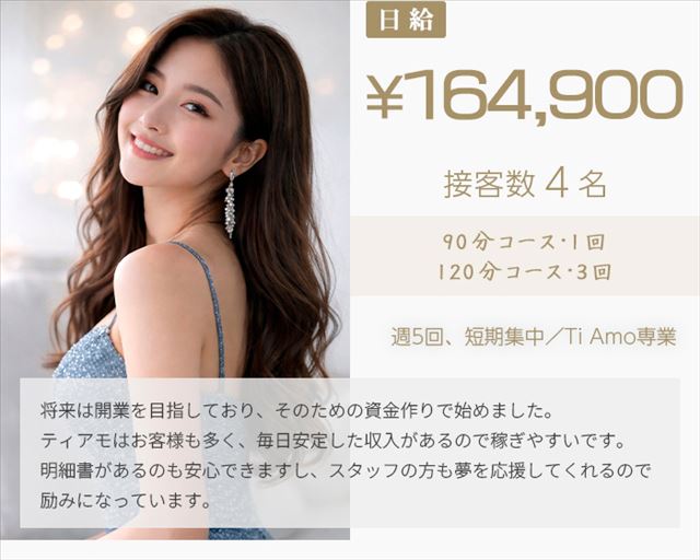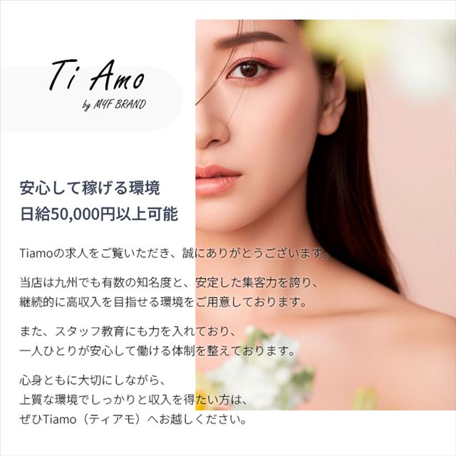 Ti Amo(ティアモ)は、安心のサポート体制と業界トップクラスの高収入をお約束します。