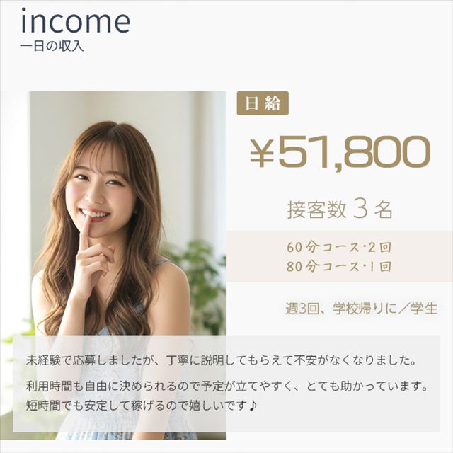 あなたのライフスタイルに合わせて自由に調整可能。学生さんやOLさん、主婦の方まで幅広く活躍中です。