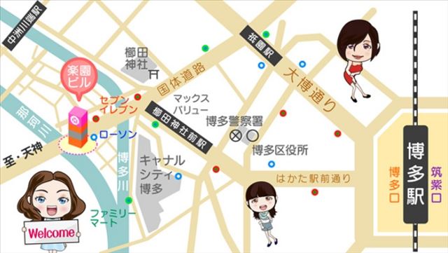 | 最寄駅 | ◆福岡市営地下鉄「中洲川端駅」より徒歩5分。 ◆西鉄バス「南新地」より徒歩2分。 ◆西鉄大牟田線「西鉄福岡駅」より徒歩8分。 ◆七隈線「櫛田神社前駅」より徒歩3分。 |
