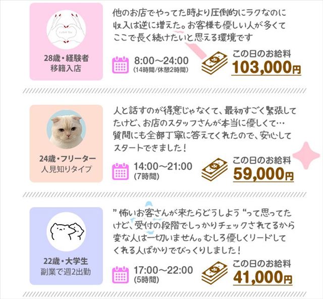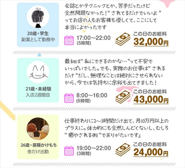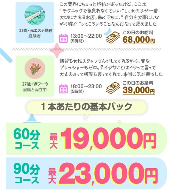 | 月給 | 1回の出勤で大体5~8万くらいで、月4-5回の出勤なので30万ないくらいかな! |