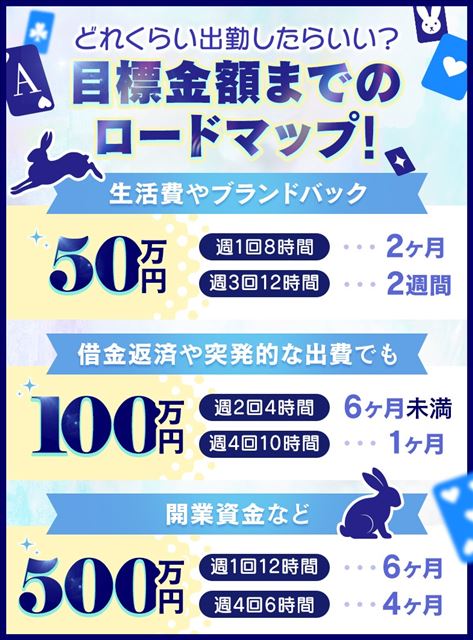 ノルマや罰金は一切なし。雑費の引き落としや不明な経費負担もありません。お仕事に必要な道具もお店で用意しているので、気兼ねなく働けます。