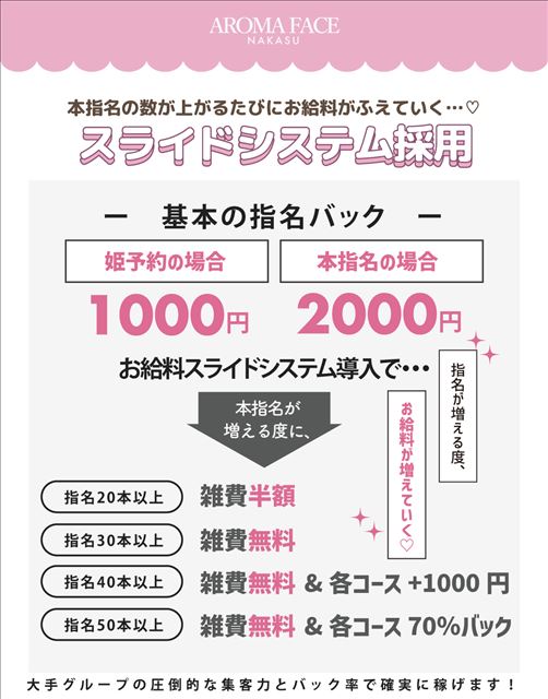 フェイスグループは、女性を稼がせる自信と実績がある大手グループで、業界の中でも長年の信頼と実績を誇ります。会員様も多数おられ、新人でも簡単に高収入を得るチャンスがあります。特に当店は「カジュアルソープ」として気軽に始めやすく、業界トップクラスの給与システムを導入。スライドシステムで頑張った分だけ給料が増え、ランキングボーナス制度もあり、さらに高額バックを目指せます。移籍希望者も大歓迎で、どんな経験やスキルをお持ちの方でもサポート体制が整っています。ほんの少しの勇気であなたの未来が輝き、確実に稼げる環境が整っています。業界未経験者も歓迎しているので、まずは体験入店から始めてみてください!信頼と実績のある環境で、一緒に夢を追いかけましょう。
