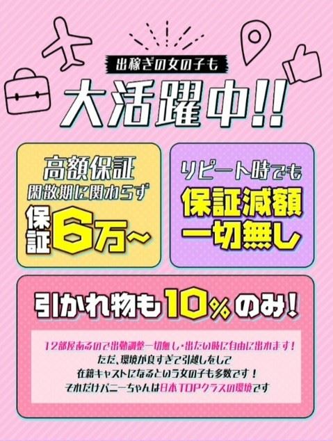 出稼ぎ未経験の方も安心して始められる環境を整えています。当店では時期を問わず出稼ぎを歓迎しており、家具・家電付きの寮を完備しているため、少ない荷物で入寮可能です。給与保証や交通費支給などの制度も充実しており、事前に丁寧にご説明いたします。さらに高待遇の「ブラックバニー枠」を新設し、高収入を目指したい方にも最適。他店で実績のある方には特別指名料の支給もあり、しっかり稼げる環境です。