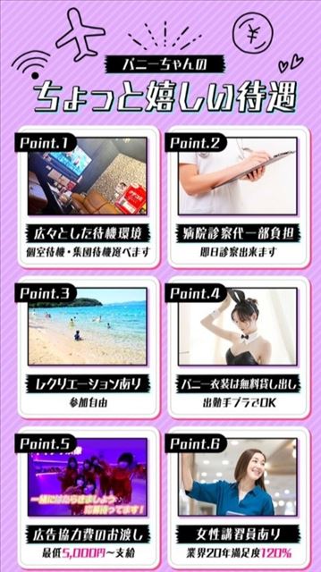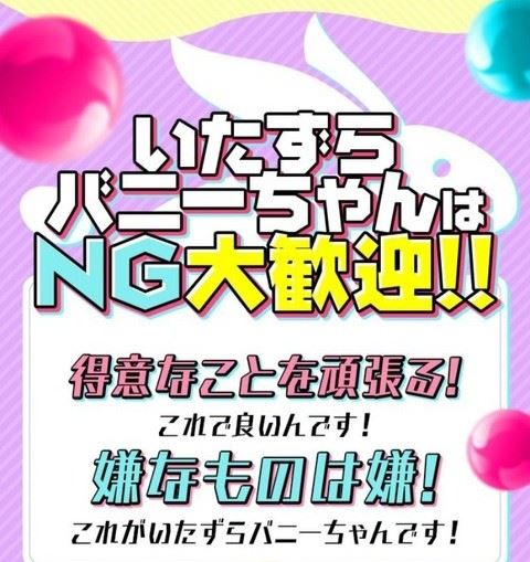 在籍女性の半数以上が未経験スタート。未経験でも無理なく働ける環境づくりを続けてきたので、安心してお仕事に集中できます。長年培った運営体制により、お客様も優しい方ばかり。「いらずらバニーちゃん」ではキスNG・フェラNG・受け身NGも大歓迎。密着やイチャイチャなど、自分の得意を活かしてしっかり稼げます。完全衛生器具着用で検査体制も万全です。