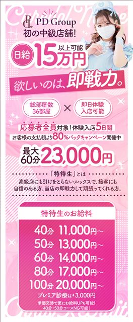 キュアドルナースでは、体験入店5日間限定で《80%バックキャンペーン》を実施中!面接は30分〜1時間ほどで、内容をしっかり説明します。身分証があればそのまま体験入店もOK。6時間で4万円〜、12時間なら9万円〜の高収入が可能です。入店特典はシンプルに「お客様支払額の80%バック」のみで、余計な条件は一切ありません。もし体験中に「合わない」と感じても、すぐに辞退やプロフィール削除ができるので安心です。納得できる環境で、自分らしくお仕事を始めてみませんか?