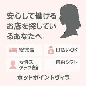 🌸安心して働ける場所を探しているあなたへ🌸こんにちは、ホットポイントヴィラのスタッフです。私たちのお店は「女の子が本当に安心して働ける場所であること」を、何よりも大切にしています。「未経験だけど大丈夫かな…」「怖いお客さんがいたらどうしよう…」「人間関係が心配…」そう思う…