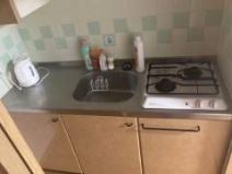 キッチン設備も充実しており、2口コンロ付きで自炊も快適に行えます。洗剤やハンドソープ、ハイター、ケトルなどの備品も揃っているため、すぐに生活を始められる環境です。さらに下段には鍋やフライパンも用意してあり、日常の料理にも困りません。