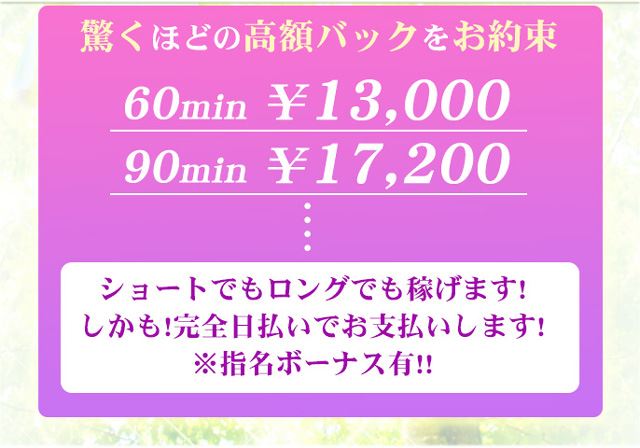 60分13,000円、90分17,200円と、短時間でもロングコースでもしっかり高収入が目指せます。